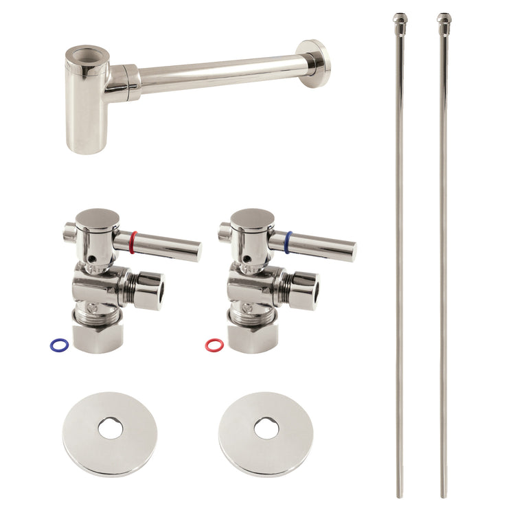 This 7-piece console sink plumbing kit from Kingston Brass provides all the necessary parts to elegantly finish the installation of your console sink. The set includes two 5/8" O.D. comp x 3/8" O.D. , comp quarter turn angle stop valves, two low profile flanges, two pieces 3/8" x 30" bull nose rigid supply lines, one modern bottle style p-trap with flange and angle stops include modern lever handle. Constructed of high quality brass and a tarnish-resistant finish, designed for long-lasting performance. Available in a variety of stunning finishes ready to match any home decor.