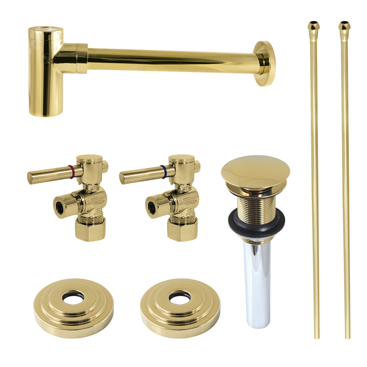 This 8-piece vessel sink plumbing supply kit from Kingston Brass provides all the necessary parts in the water flow process of your vessel sink. The set includes two 1/4 turn hardisc angle stops with lever handles, two 30" bullnose supply line, two contemporary decorative flanges, a contemporary 1-1/4" OD decorative bottle-trap and a 22 gauge 1-1/4" vessel sink drain with overflow. Constructed of high quality brass and a tarnish-resistant finish, designed for long-lasting performance. Available in a variety of stunning finishes ready to match any home decor.