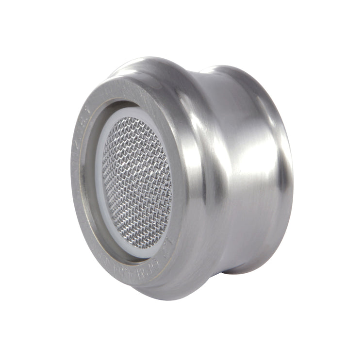 Installed at the ends of household faucets, aerators are designed with mesh screens to reduce splashing and dripping in sinks. A mixture of water and air is delivered while also helping to conserve water. This aerator's thread size: US female 55/64"-27 UNS connection. The water flow rate is 1.2 gallons per minute (GPM).