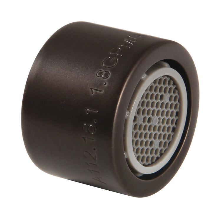 Installed at the ends of household faucets, aerators are designed with mesh screens to reduce splashing and dripping in sinks. A mixture of water and air is delivered while also helping to conserve water. This aerator's thread size: US female 3/4"-27 UNS connection. The water flow rate is 1.8 gallons per minute (GPM).