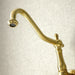 Crafted in commendations to English nobility, the exemplary design of this faucet manifests regality and elegance with its black porcelain handles. Because of the horizontal pop that it gives, it is more of a centerpiece, perfect for planning a design around. Additionally, the unique look is great for a variety of styles from Art Deco to Farmhouse. The brushed brass finish will also provide a long lasting and warm touch to your kitchen ensemble. Allow the brass construction and swivel abilities to provide a sturdy and reliant fixture as it maximizes your counter space. Glamorize your home today with the traditional elegance of this faucet.