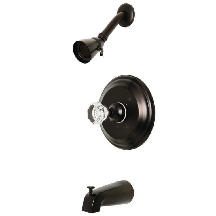 Evoke extravagant splendor and personality within your interior home design with this tub and shower faucet's crystal inspired accents. Complete with an easy-to-turn knob handle, an optimum bathing experience awaits. Enjoy the sturdy brass construction and premium oil rubbed bronze finish for a fixture that will last for years to come. A pressure balanced valve is included for safety and protection against accidental burns.
