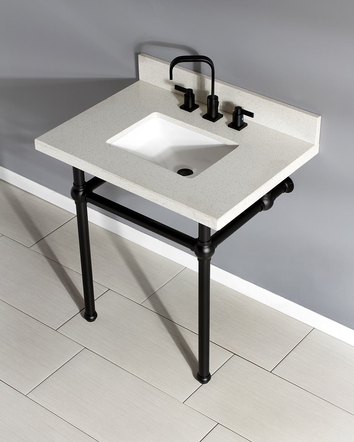 Embodying such a concept is Kingston Brass’ latest release of the White Quartz Vanity with Sink and Brass Feet. Simplistic refinement meets versatile functionality in this state-of-the-art fixture. Featuring unique matte black pipe-like legs and a polished marble surface, this sink is undeniably the epitome of the emblematic style of the century.