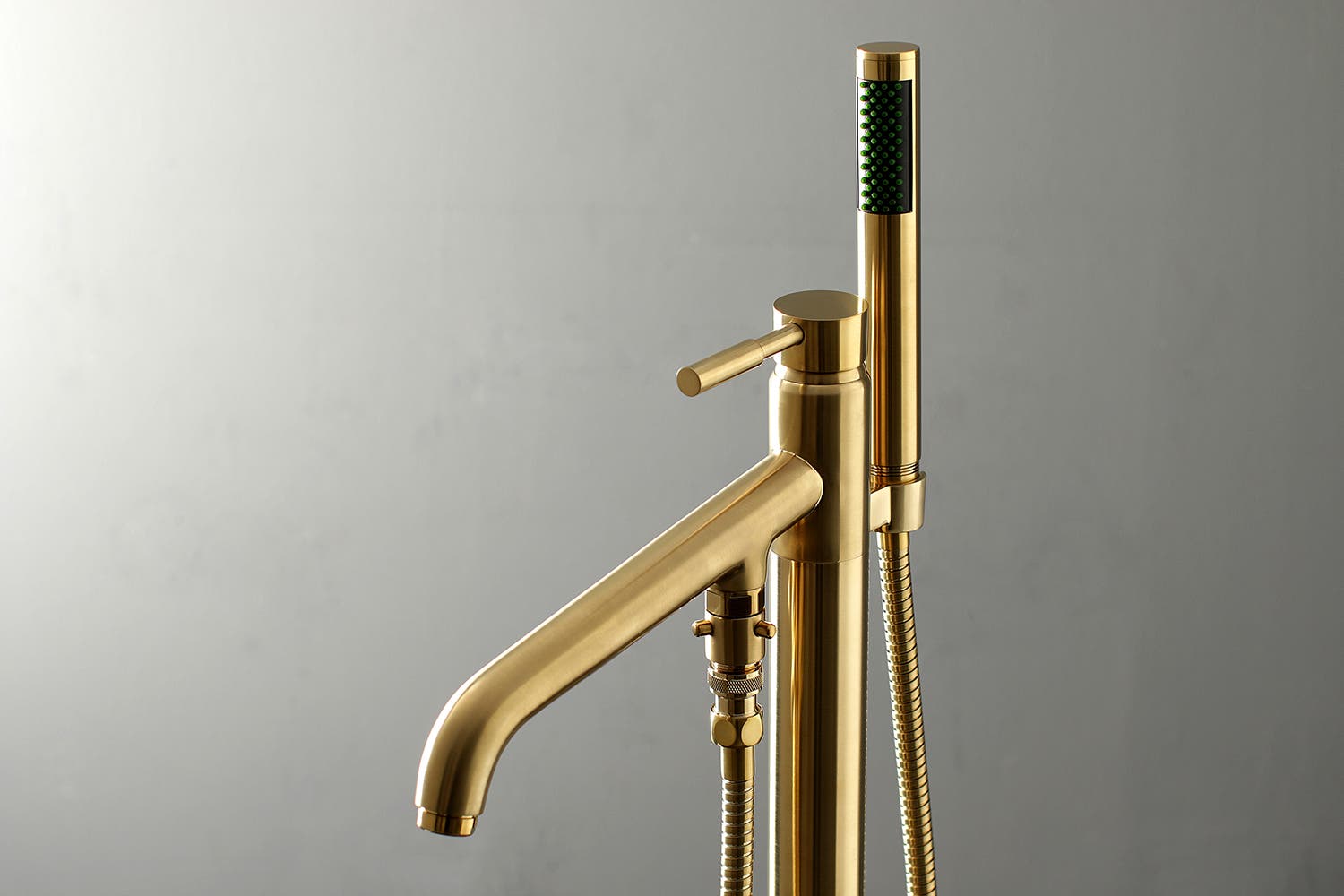 Admired for its advanced functionality and modern ornamental architecture, freestanding tub faucets are an excellent fixture to complement a freestanding bathtub. Unlike its sibling, the deck mount tub filler, its freestanding construction is acclaimed for its versatility and adaptability in that it can be easily relocated and directly attaches to the plumbing system. Try the Concord Freestanding Tub Filler with Hand Shower in satin brass for unparalleled Roaring 20’s-esque glamor. Its opulent contemporary design nearly towers over the tub or shower, making it the focal point of the bathroom. For those that seek unique statement pieces for their home, freestanding tub faucets are an excellent fixture to consider.