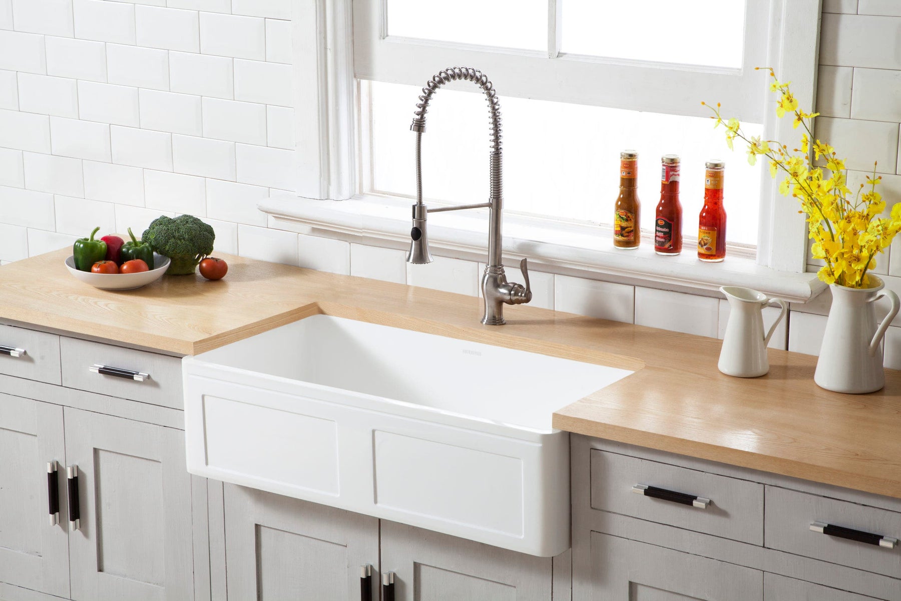 Embellish your kitchen interior with the Kingston Brass solid surface White Stone apron front farmhouse kitchen sink. Constructed from solid surface White Stone resin, expect a sink that is designed for long-lasting durability. Because of the glossy white matte white finish, the exterior is easy to clean and also features a corrosion-resistant finish. The sink itself has overall dimensions of 36″ x 18″ x 9-9/16″ and a bowl size of 34-1/8″ x 16-1/8″ x 8-5/16″ and is covered by a 1-year limited warranty.