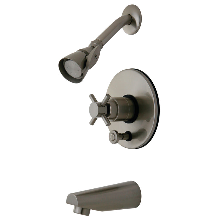 Dive into modern design with the sleek and cylindrical styling of this tub and shower faucet. Complete with an easy-to-turn cross handle, an optimum bathing experience awaits. Enjoy the sturdy brass construction and premium brushed nickel finish for a fixture that will last for years to come. A pressure balanced valve is included for safety and protection against accidental burns.
