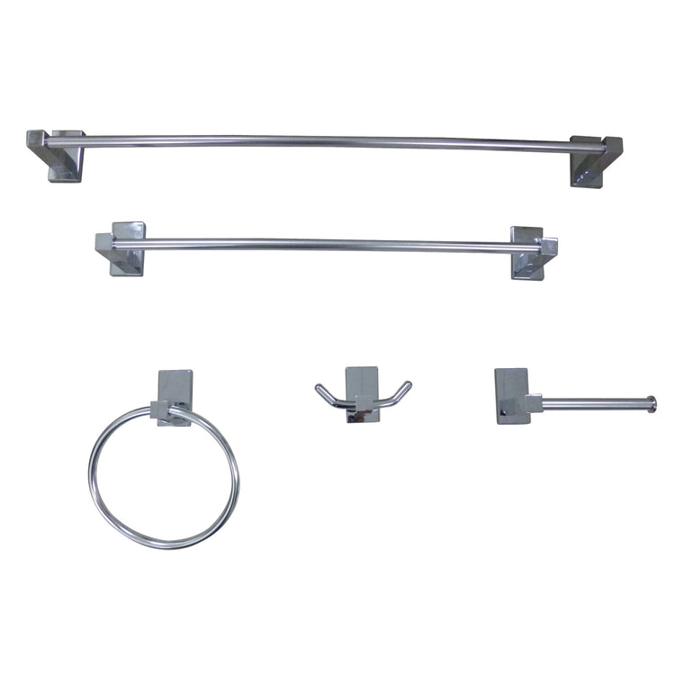 • 5-piece set includes: 18" (457.2 mm) towel bar, 24" (609.6 mm) towel bar, towel ring, robe hook, and toilet paper holder