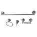 • 4-piece set includes: 24" towel bar, towel ring, robe hook, and toilet paper holder