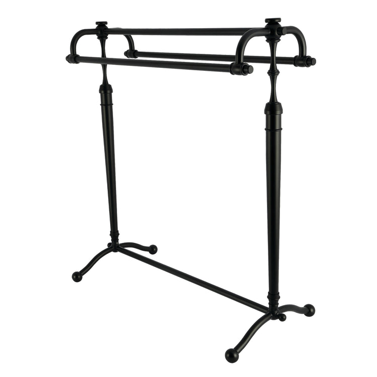 The Warwick freestanding towel racks are designed to match the Edwardian and Habsburg console vanity collections and integrate with a number of traditional European-influenced design styles including English Cottage, French Country, Victorian, and Nautical. This towel rack features spindle-detailed uprights and ball finial adornments as well as an inverted U-shaped top that arranges the towel bars to maximize utility and save space. The rack stands 33-1/8" Tall x 31-1/4" Wide x 13" Deep. The top bar rests between the top of the uprights, and the front and back lower bars at the ends of the U-shaped top are 29-1/16" above the floor level.