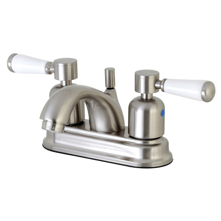Crafted to bring aesthetic beauty alongside exceptional performance, the feature of porcelain lever handles and rounded architecture solidifies pristine refinement in this faucet. Centerset bathroom faucets are ideal for smaller bathrooms and feature an easy 3-hole installation. The Paris 4-inch centerset bathroom faucet and its featured sturdy brass construction and premium brushed nickel finish are guaranteed to glamorize your home's modern ensemble for years to come. Embolden your home ensemble with the addition of this exquisite fixture. A matching finish drain is also included.