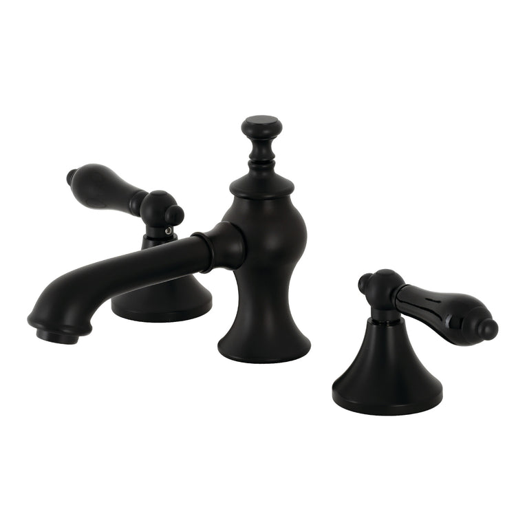 Crafted in commendations to English nobility, the exemplary design of this faucet manifests regality and elegance with its black porcelain handles. Ideal for more spacious bathrooms, widespread faucets are more spread apart and feature a 3-hole installation. The Duchess widespread bathroom faucet with brass pop-up and its featured sturdy brass construction and premium matte black finish are guaranteed to glamorize your home's traditional ensemble for years to come. Glamorize your home today with the traditional elegance of this faucet. A matching finish drain is also included.
