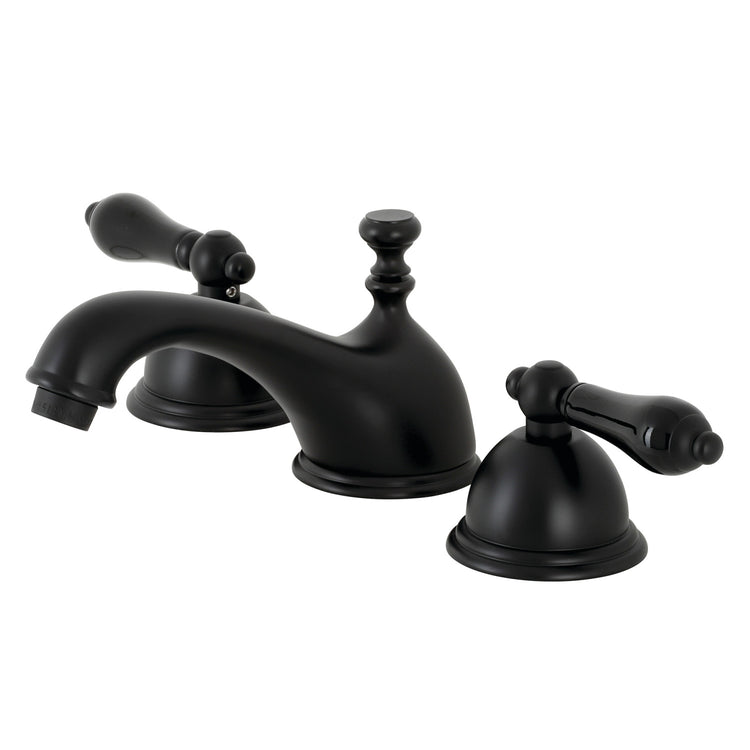 Crafted in commendations to English nobility, the exemplary design of this faucet manifests regality and elegance with its black porcelain handles. Ideal for more spacious bathrooms, widespread faucets are more spread apart and feature a 3-hole installation. The Duchess widespread bathroom faucet with brass pop-up and its featured sturdy brass construction and premium matte black finish are guaranteed to glamorize your home's traditional ensemble for years to come. Glamorize your home today with the traditional elegance of this faucet. A matching finish drain is also included.