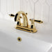 The exquisite design of this faucet tastefully flatters the elegant architecture of traditional homes with its fine detailing. centerset bathroom faucets are ideal for smaller bathrooms and feature an easy 3-hole installation. The Kingston Brass 4" centerset bathroom faucet, with its featured sturdy brass construction and premium polished brass finish, are guaranteed to glamorize your home's traditional ensemble for years to come. A matching finish drain is also included.
