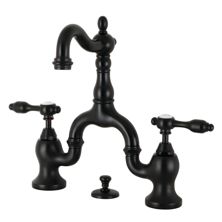 Kingston Heirloom KS7970TAL - Tudor Two-Handle 3-Hole Deck Mount Bridge Bathroom Faucet with Brass Pop-Up, Matte Black