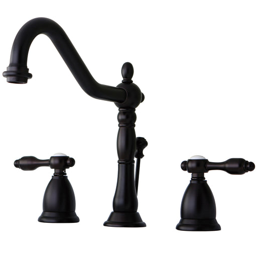 Kingston BrassKingston Heirloom KS1995TAL - Tudor Two-Handle 3-Hole Deck Mount Widespread Bathroom Faucet with Brass Pop-Up, Oil Rubbed Bronze Offering a nod ...