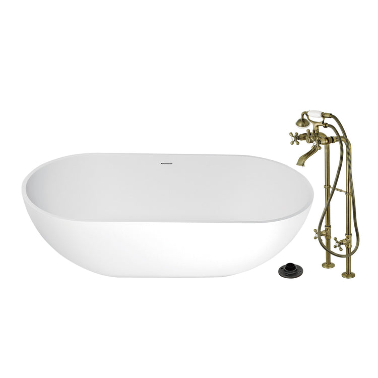 Kingston Tulare KRTRS7035266K3 - Arcticstone 70-Inch Solid Surface Oval Double Ended Freestanding Tub with Faucet Combo and Drain, Antique Brass