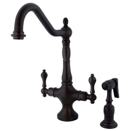 Kingston BrassHeritage KS1775ALBS Two-Handle 2-Hole Kitchen Faucet with Brass Sprayer, Oil Rubbed Bronze A lavish spark of traditionally stylized glamour is b...