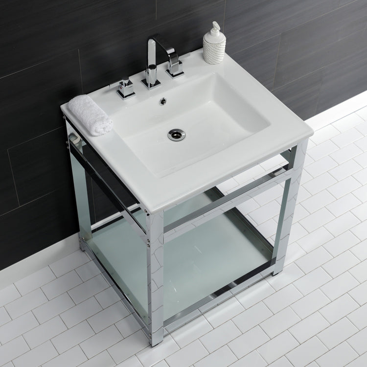 Kingston Quadras VWP2522W8B1 25-Inch Ceramic Console Sink with Steel Base and Glass Shelf (8-Inch, 3-Hole), White/Chrome
