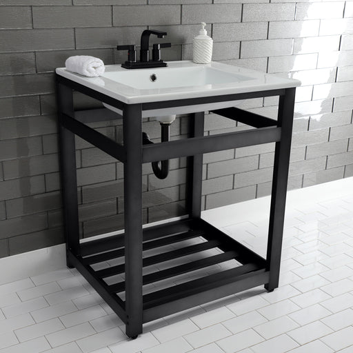 Kingston BrassKingston Sona VWP2522W4A0 - Quadras 25-Inch Ceramic Console Sink with Steel Base and Shelf (4-Inch, 3-Hole), White/Matte Black Exquisitely style...