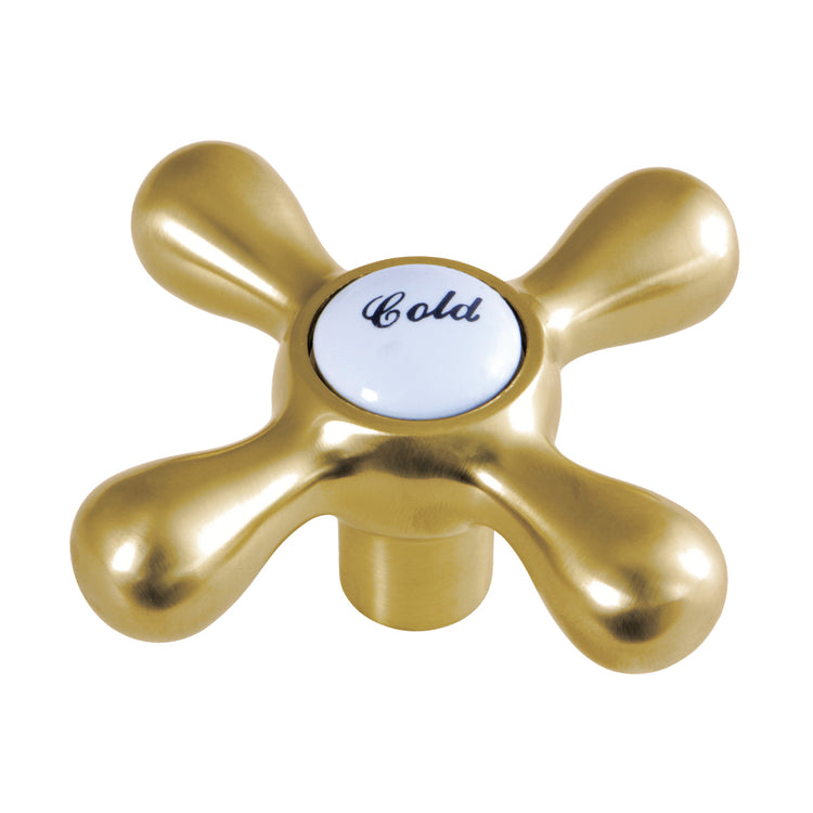 Featured in several of Kingston Brass' state-of-the-art faucets is the magnificent cross handle. Renowned for its traditional elegance, the cross handle is the perfect embodiment of effortless operation, dependable construction, and sophisticated artistry. Made famous by its appearance on some of the first-known, operating faucets, the cross handle is commended for its easy use compared to the knob and its unobtrusive architecture compared to the lever. Embellish your home with the sophisticated refinement of the classic cross handle. Kingston Brass is here to help you improve the functionality of all your household bathroom and kitchen fixtures with its assortment of replacement appliance parts that include aerators, drains and supply lines. This metal cross handle provides effortless mobility and style for easy adjustment of water temperature and volume. Use as a replacement part to match with brushed brass fixtures.