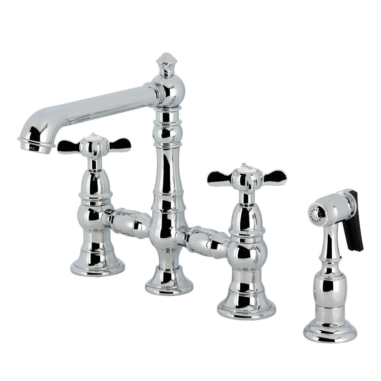 Kingston Tulare KS7271BEXBS - Essex Two-Handle 4-Hole Deck Mount Bridge Kitchen Faucet with Brass Sprayer, Polished Chrome