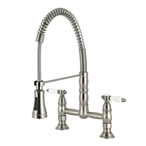Original price $709.95 - Original price $709.95Original price $709.95$709.95$709.95 - $709.95Current price $709.95| /Kingston Tulare GS1278BPL - Bel-Air Double-Handle 2-Hole Deck-Mount Pre-Rinse Bridge Kitchen Faucet, Brushed Nickel
