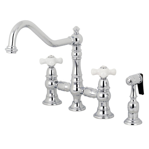 Original price $714.95 - Original price $714.95Original price $714.95$714.95$714.95 - $714.95Current price $714.95| /Kingston Heirloom KS3271PXBS - Restoration Two-Handle 4-Hole Deck Mount Bridge Kitchen Faucet with Brass Sprayer, Polished Chrome