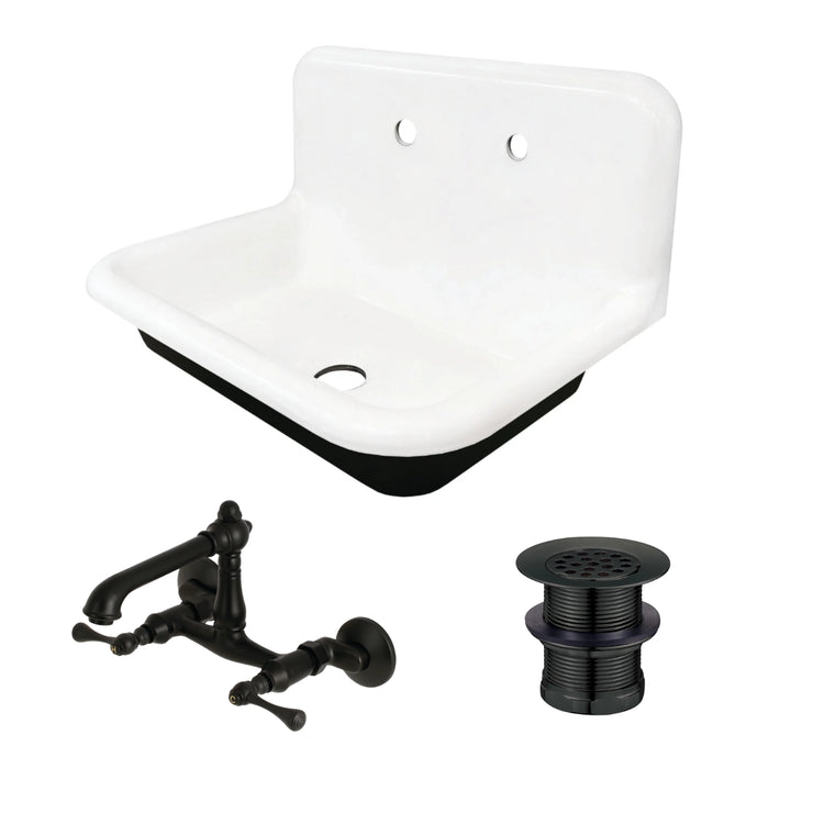 Kingston Brass Kitchen Sink Combo - Towne 30-Inch Cast Iron Wall Mount Single Bowl Kitchen Sink with Wall-Mount Bridge Kitchen Faucet and Basket Strainer, Matte Black