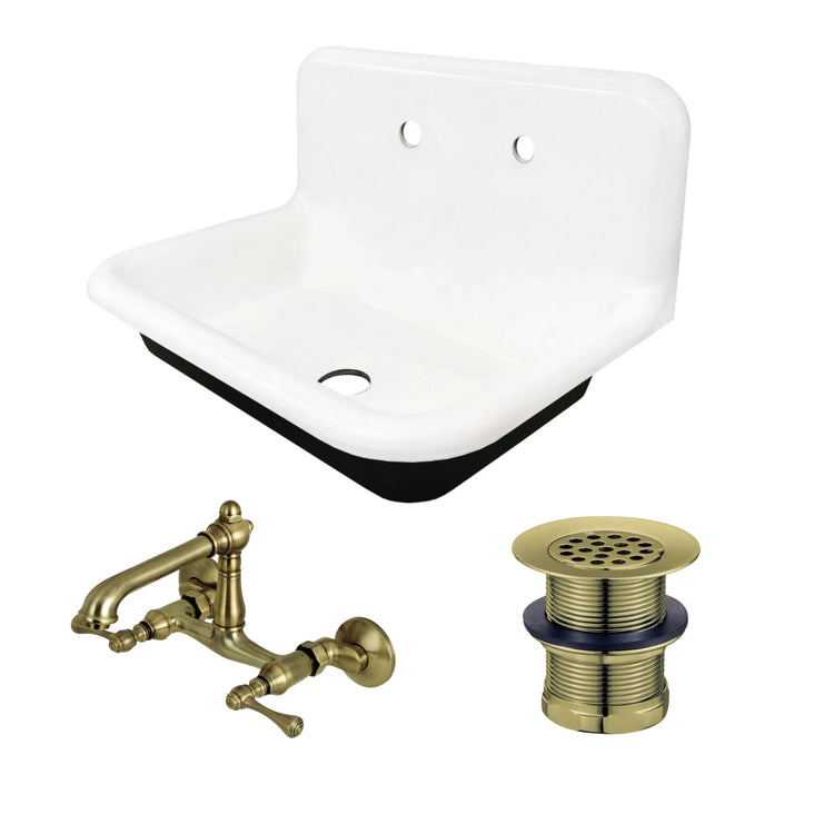 Kingston Brass Kitchen Sink Combo - Towne 30-Inch Cast Iron Wall Mount Single Bowl Kitchen Sink with Wall-Mount Bridge Kitchen Faucet and Basket Strainer, Antique Brass
