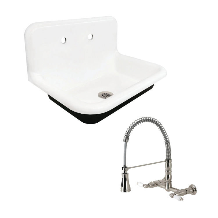 Kingston Brass Kitchen Sink Combo - Towne Cast Iron Single Bowl Wall Mount Utility Sink  with Wall-Mount Pre-Rinse Bridge Kitchen Faucet and Basket Strainer, Brushed Nickel