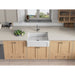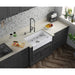 The oversized single bowl farmhouse sink is ergonomically designed with the user in mind. Positioned close to the edge of the counter in a glossy white finish, it eliminates back strain from leaning over a more distant basin. With ample room for washing large pots and pans, this sink provides an ease of use that complements its visual appeal as the centerpiece of a traditionally styled kitchen.