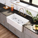 The oversized single bowl farmhouse sink is ergonomically designed with the user in mind. Positioned close to the edge of the counter in a glossy white finish, it eliminates back strain from leaning over a more distant basin. With ample room for washing large pots and pans, this sink provides an ease of use that complements its visual appeal as the centerpiece of a traditionally styled kitchen.