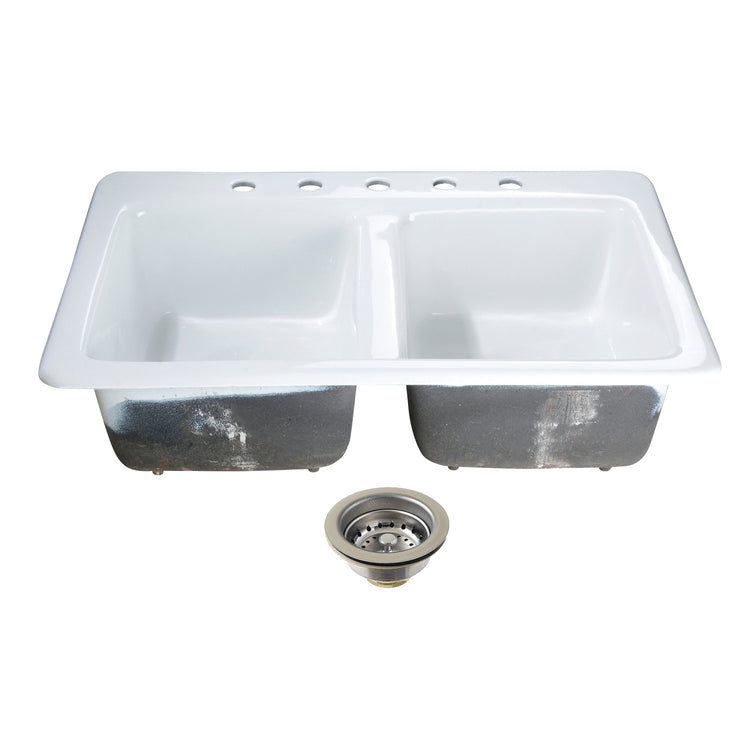 Kingston Heirloom KGT33229D51 - Petra Galley 33-Inch Cast Iron Self-Rimming Double Bowl Drop-In Kitchen Sink (5-Hole) with Basket Strainers x 2, White/Polished Chrome