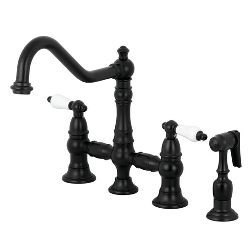 Kingston BrassKingston Heirloom KS3270PLBS - Restoration Two-Handle 4-Hole Deck Mount Bridge Kitchen Faucet with Brass Sprayer, Matte Black Classical artistry...
