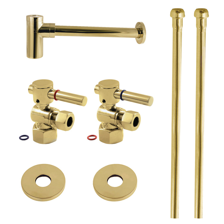 This 7-piece console sink plumbing kit from Kingston Brass provides all the necessary parts to elegantly finish the installation of your console sink. The set includes two 1/2"-14 NPT inlet x 3/8" O.D. comp quarter turn angle stop valves, two low profile flanges, two pieces 3/8" x 30" bull nose rigid supply lines, one modern bottle style p-trap with flange, and angle stops include modern lever handle. Constructed of high quality brass and a tarnish-resistant finish, designed for long-lasting performance. Available in a variety of stunning finishes ready to match any home decor.