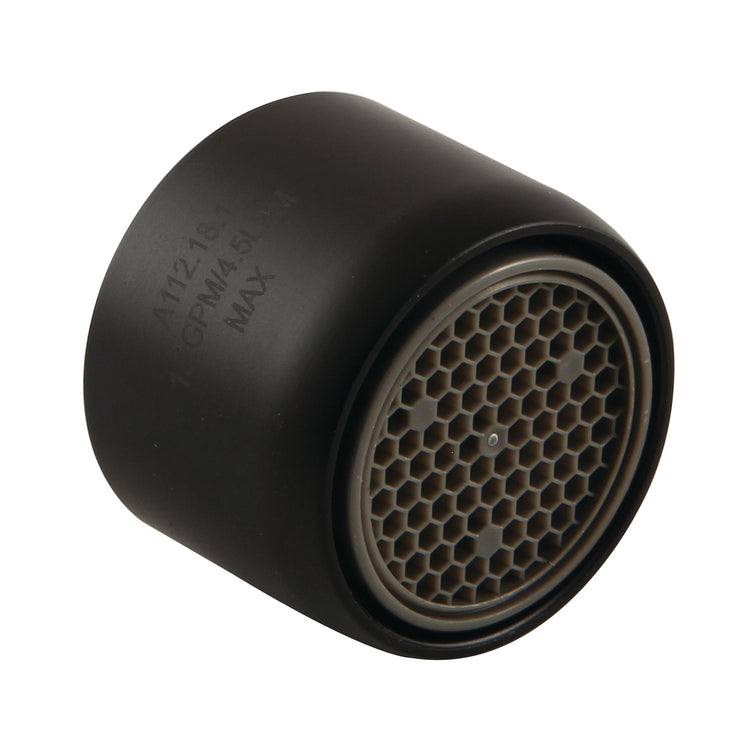Installed at the ends of household faucets, aerators are designed with mesh screens to reduce splashing and dripping in sinks. A mixture of water and air is delivered while also helping to conserve water. This aerator's thread size: US female 55/64"-27 UNS connection. The water flow rate is 1.2 gallons per minute (GPM).