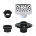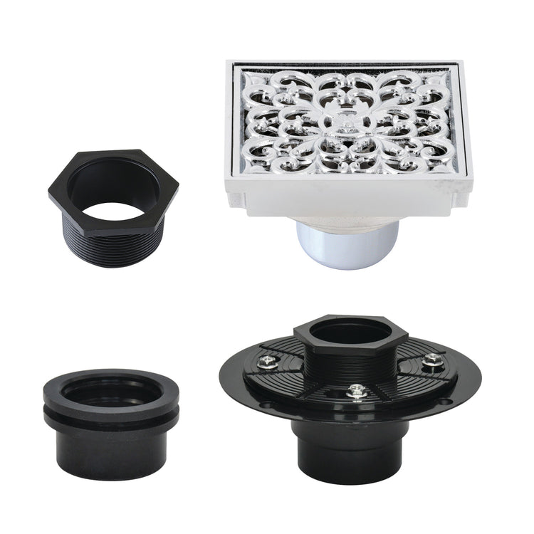 From simple, non-obtrusive grid-cut floor drains to ornate embossed floral patterns, the Watercourse collection offers a range of selections. The drains install in various ways and fit a range of square and circular drain openings. Please see each drain for its detailed specifications and compatibility. This Art nouveau-themed drain flange in the Watercourse collection fits a 4" x 4" square. It features a pattern of geometric shapes reminiscent of that specific design era over a circular hair catcher to prevent foreign objects from entering your drain.