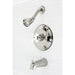 The traditional charm of this tub and shower faucet brings classical artistry to your home. Complete with an easy-to-turn cross handle, an optimum bathing experience awaits. Enjoy the sturdy brass construction and premium brushed nickel finish for a fixture that will last for years to come. A pressure balanced valve is included for safety and protection against accidental burns.
