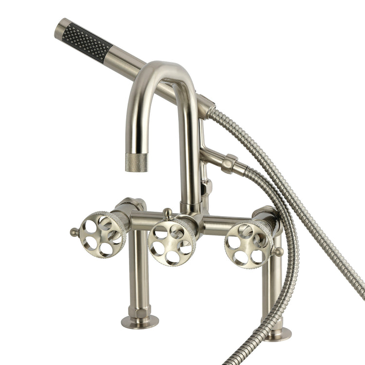 Kingston Sona AE6008RKX - Webb Three-Handle 2-Hole Deck-Mount Clawfoot Tub Faucet with Knurled Handle and Hand Shower, Brushed Nickel