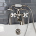 Vintage opulence finds itself within this deck-mount clawfoot tub faucet. As the perfect complement to your tub, this will complete your refined bathroom decorum with the help of its premium, glistening brushed nickel finish and telephone style hand shower. The solid brass construction also makes for a heavy, quality made product. Hand shower with porcelain handle and 59-inch hose.