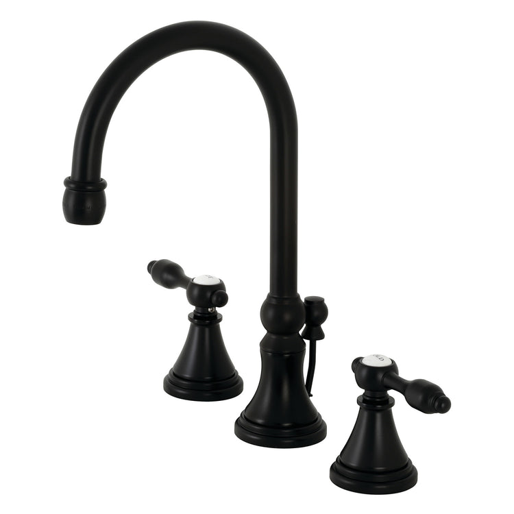 Offering a nod toward the past, this faucet is beautifully inspired by the vintage elegance of mid-19th Century design. Ideal for more spacious bathrooms, widespread faucets are more spread apart and feature a 3-hole installation. The Tudor widespread bathroom faucet with brass pop-up and its featured sturdy brass construction and premium matte black finish are guaranteed to glamorize your home's traditional ensemble for years to come. A unique and classically enchanting personality is embodied in this centerpiece. A matching finish drain is also included.