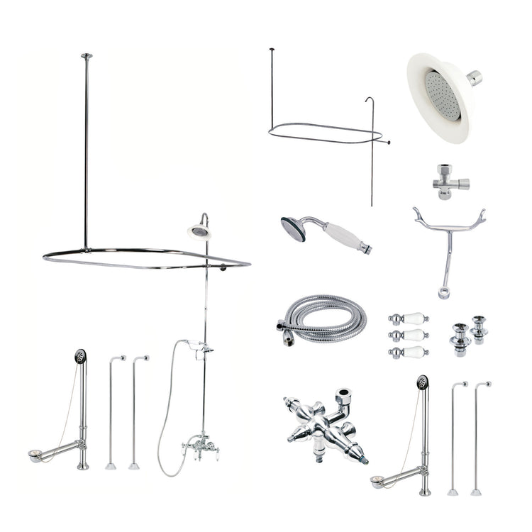 To wrap up your traditionally styled home decorum, incorporate the refinement of one of Kingston Brass' clawfoot tub faucet packages for an all-inclusive and reliable complement to your clawfoot tub. A top-to-bottom beautiful styling is achieved with these coordinated pieces from the shower enclosure down to the drain. All included products are made from sturdy materials and a premium finish for a reliable and long lasting set to last for years to come. Includes faucet, water supply lines, angle stop valves, drain, and shower enclosure.