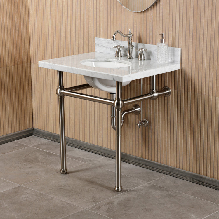 Kingston Heirloom CKVPB3030MB8 - Templeton 30-Inch Carrara Marble Console Sink Set with Widespread Bathroom Faucet and Plumbing Trim Kit (8-Inch, 3-Hole), Carrara Marble White/Brushed Nickel