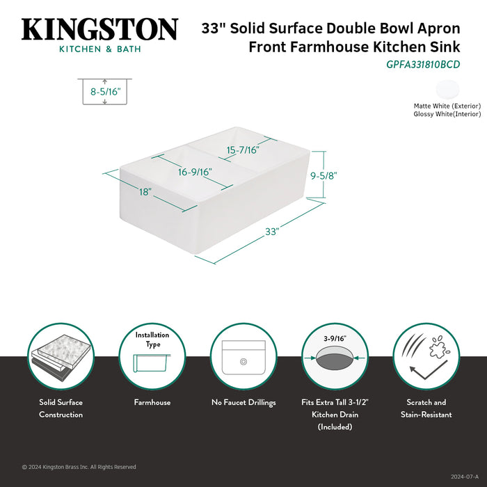 Arcticstone GPFA331810BCD 33-Inch Solid Surface White Stone Apron-Front Double Bowl Farmhouse Kitchen Sink with Strainers x 2, Matte/Glossy White