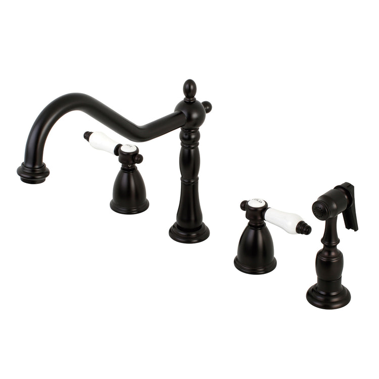 The graceful elegance of timeless design is beautifully merged between British flair and Victorian delicacy within this faucet's white porcelain levers. Able to fit a variety of sink set-ups, widespread kitchen faucets can be utilized in several multi-hole configurations. These are ideal for larger kitchens, as they are more spread apart, and with the included side-sprayer feature a 4-hole installation. The oil rubbed bronze finish will also provide a long lasting and warm touch to your kitchen ensemble. Allow the brass construction to provide a sturdy and reliant fixture.