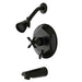 Integrating eclectic style in your home is easy with this tub and shower faucet's classical design. Complete with easy-to-turn cross handles, an optimum bathing experience awaits. Enjoy the sturdy brass construction and premium oil rubbed bronze finish for a fixture that will last for years to come. A pressure balanced valve is included for safety and protection against accidental burns.