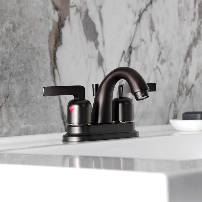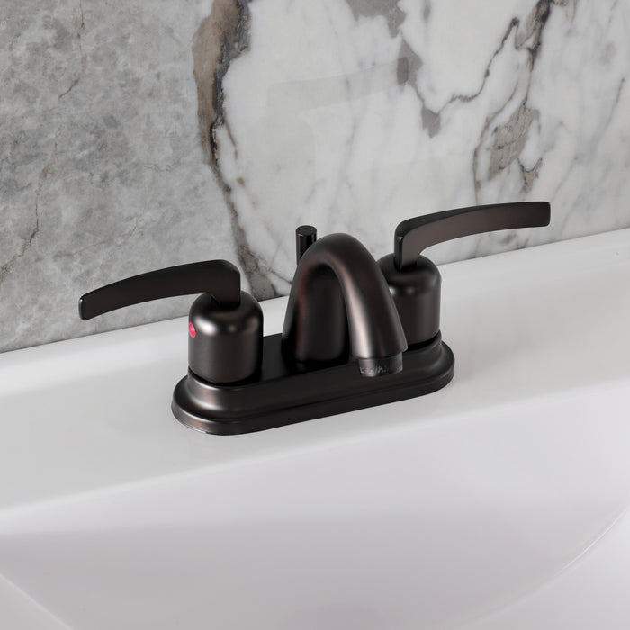 The innovative, sleek design of this faucet will enhance contemporary decor Centerset bathroom faucets are ideal for smaller bathrooms and feature an easy 3-hole installation. The Centurion 4-inch centerset bathroom faucet with retail pop-up and its featured sturdy brass construction and premium oil rubbed bronze finish are guaranteed to glamorize your home's modern ensemble for years to come. Upgrade your contemporary home into a place of elite sophistication with this faucet. A matching finish drain is also included.