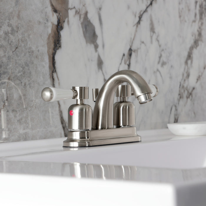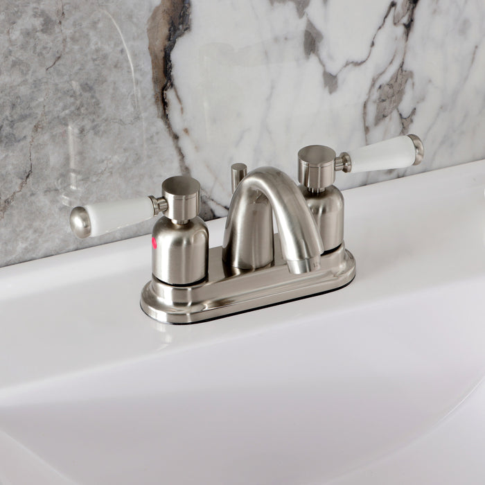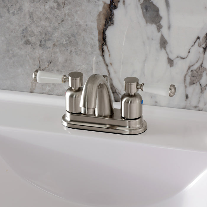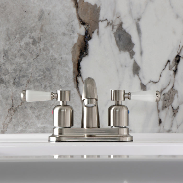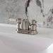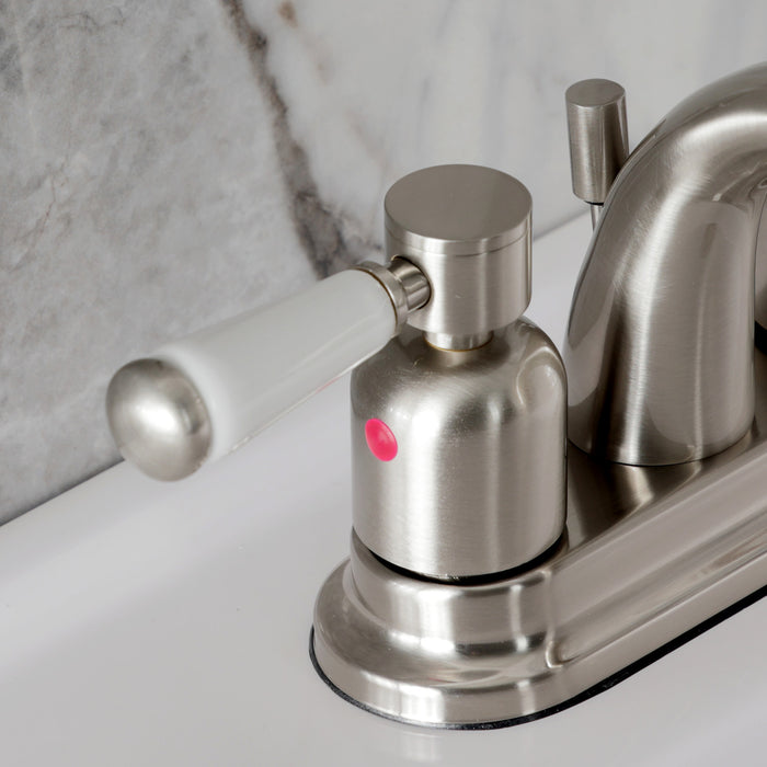 Crafted to bring aesthetic beauty alongside exceptional performance, the feature of porcelain lever handles and rounded architecture solidifies pristine refinement in this faucet. Centerset bathroom faucets are ideal for smaller bathrooms and feature an easy 3-hole installation. The Paris 4-inch centerset bathroom faucet with retail pop-up and its featured sturdy brass construction and premium brushed nickel finish are guaranteed to glamorize your home's modern ensemble for years to come. Embolden your home ensemble with the addition of this exquisite fixture. A matching finish drain is also included.