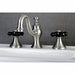 Crafted in commendations to English nobility, the exemplary design of this faucet manifests regality and elegance with its black porcelain handles. Ideal for more spacious bathrooms, widespread faucets are more spread apart and feature a 3-hole installation. The Duchess 8" Widespread Bathroom Faucet, with its featured sturdy brass construction and premium brushed nickel finish, are guaranteed to glamorize your home's traditional ensemble for years to come. Glamorize your home today with the traditional elegance of this faucet. A matching finish drain is also included.