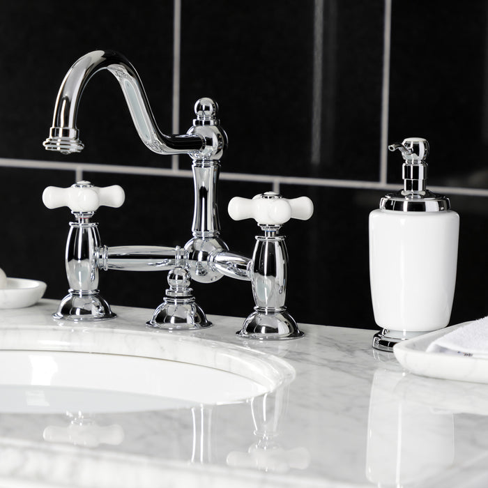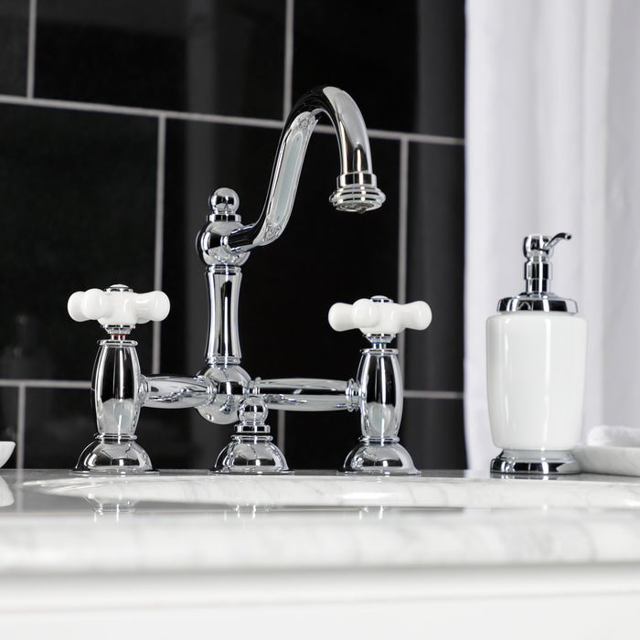 Kingston Heirloom KS3911PX - Restoration Two-Handle 3-Hole Deck Mount Bridge Bathroom Faucet with Brass Pop-Up, Polished Chrome